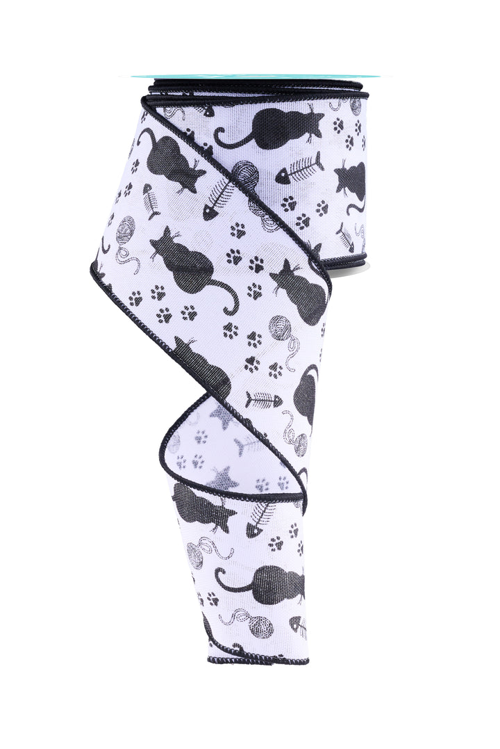 2.5"x10yd Cat Silhouette Wired Edge Ribbon, Black/White, Yarn, Fish Bones, Paw Prints