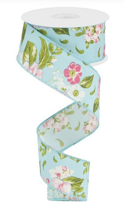 1.5"X10yd Floral on Light Blue Background Wired Edge Ribbon
