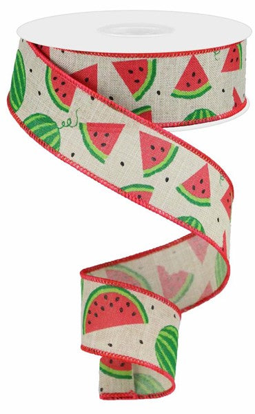 1.5" Watermelon Slices Canvas Ribbon: Natural (10 Yards) Summer Watermelon Wired Ribbon RG0199118