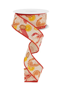 1.5" x 10yd Crawfish On Royal Burlap Wired Edge ribbon, Crawfish, Shrimp, Corn, Potatoes