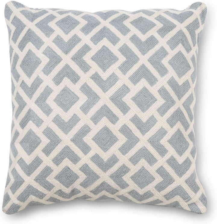 19 Inch Square Light Blue and White Embroidered Pillow with Geometric Design