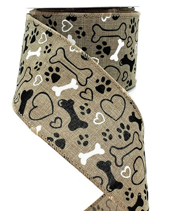 2.5" Bone Paw Print Ribbon: Natural (10 Yards) Dog Lover Wired Ribbon-Black Print