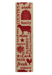 2.5" W X 10 yds long. Red print farmhouse wired edge ribbon on natural tan background.