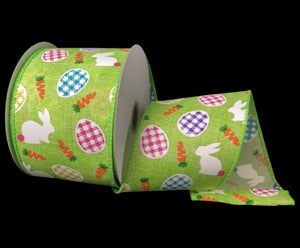 2.5" X 10yd Easter Wired Linen Printed Bunnies with Gingham Eggs Ribbon on Green