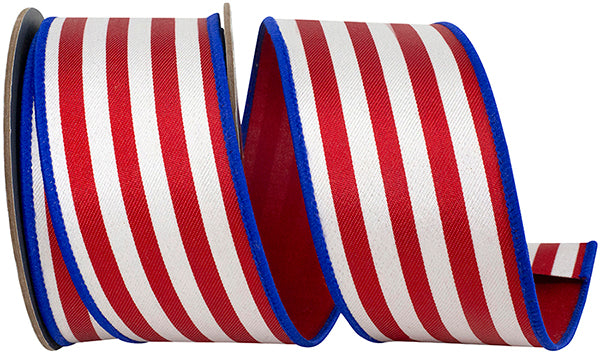 2.5" x 10yd Red and White Striped Twill Deluxe Dupioni Backed Ribbon with Blue Wired Edge. This ribbon is truly luxurious with deep color and high end design.