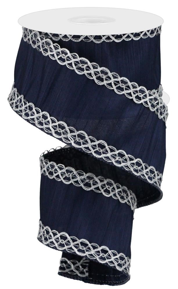 2.5"X10yd Navy Blue Faux Dupioni with Metalic Silver Trim