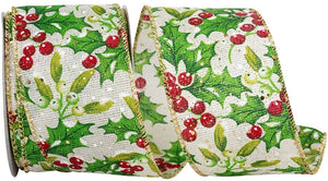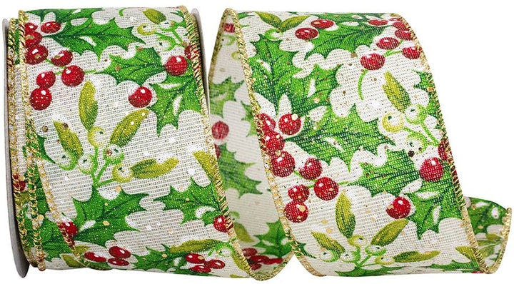 2.5"x10yd Reliant Ribbon Holly Berries and Leaves Glimmer Wired Edge Ribbon, Green/red