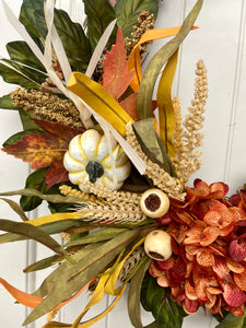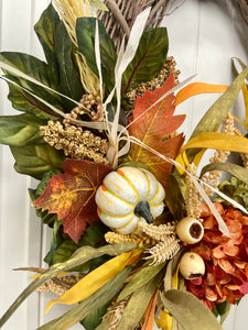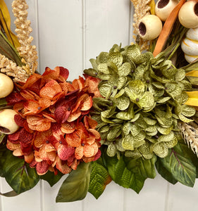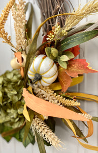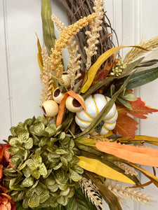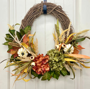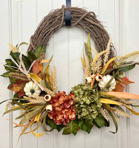 This brand new exclusive Door and Decor handmade design is the perfect door wreath for Fall and Thanksgiving. The gorgeous wreath incorporates hydrangeas with cream pumpkins, cream berry sprays, wheat stems, Maple leaves, and wispy grass for a full and inviting look. This wreath is sure to warm your front entry, porch, or interior door. Made of all faux materials, it is built to last! The components are all high quality including the natural grapevine wreath base.