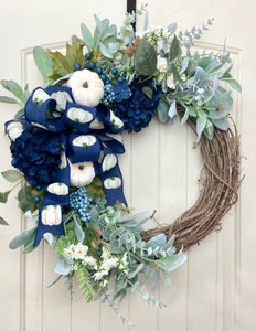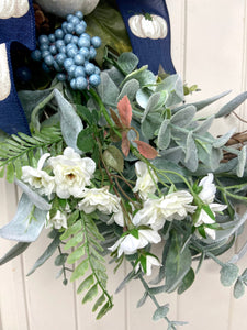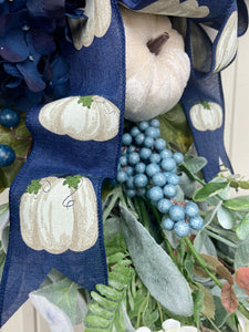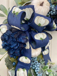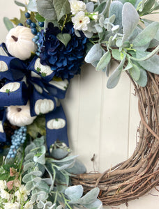 This new wreath design exclusively from Door and Decor is on trend with the colors of Fall. The deep blue hydrangeas and cream pumpkins offer a beautiful contrast. We have also added lambs ear, small white flower sprays and light blue berries to blend all of the colors together. It is truly a work of art! The ribbon is ideal for this wreath. This wreath looks great on cream doors as shown, white entry doors, or even stained and glass doors. The components are all very high quality. This wreath is sure to liven up your door this fall and Thanksgiving!