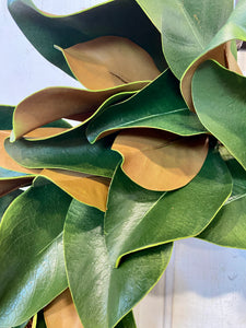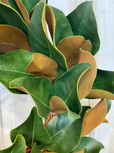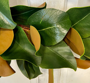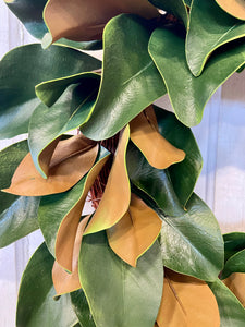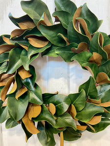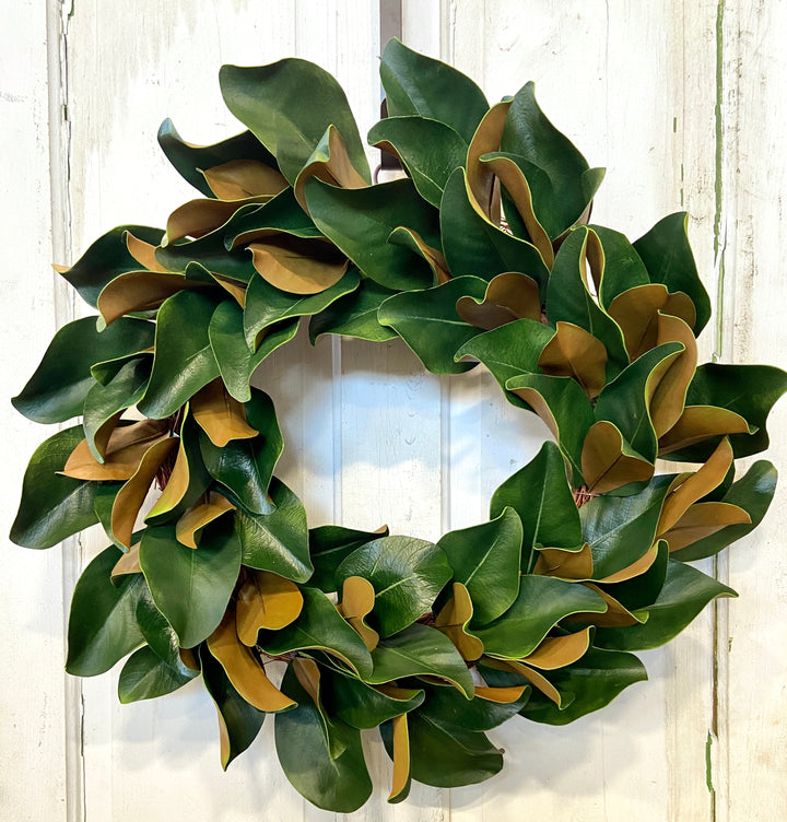 This 24" Diameter faux magnolia leaf wreath is the perfect size for most front doors. The leaves are green on the front and light tan on the back for a realistic look. The leaves are also lightly textured to resemble the real thing. The backing for this design is a very lightly stained red twig base. The color is a sort of cross between red and tan. It gives the wreath a bit more interest from the reverse side.