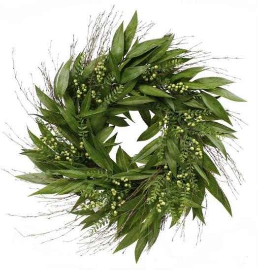 Bay Leaf Wreath for Spring and Summer Front Door Decor in 22-24" Diameter tip to tip. The wreath will come slightly more condensed to about 21 inches to prevent damage during shipment. Simply gently spread the stems outward to reach the full size of this wreath.