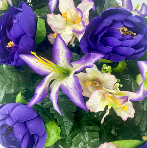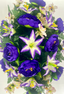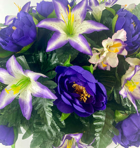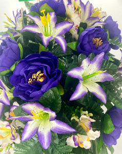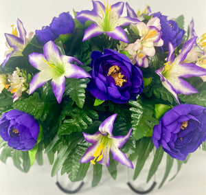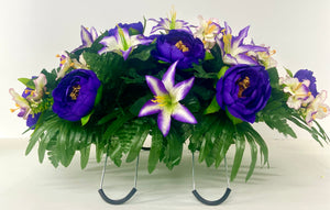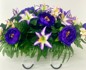 Cemetery Saddle Headstone Decoration with purple peonies and purple and cream lilies for Mother's Day, Father's Day, Valentine's, Spring and Summer