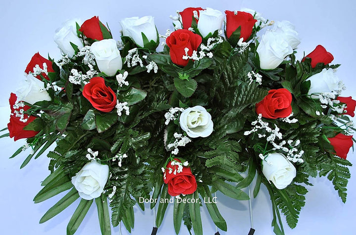 Cemetery Saddle Headstone Decoration with Red and White Roses for Mother's Day, Father's Day, Memorial Day, and Labor Day