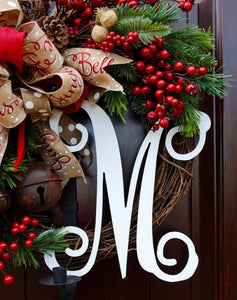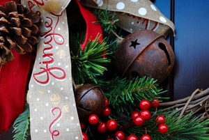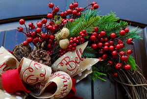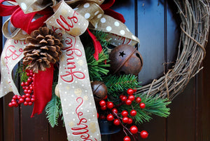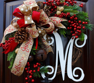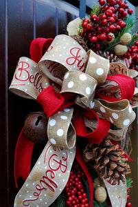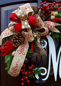 If you are looking for a high quality, simple Christmas wreath, this is the one for you! Pine branches with pine cones and rustic jingle bells make up the bulk of this wreath. The Jingle Bell ribbon is gorgeous on linen ribbon and a touch of red glitter. Red berry sprays are added for a nice punch of color. Simple, elegant, and understated are the qualities of this wreath. We can also add a monogram of your choice in red or white to complete the look.