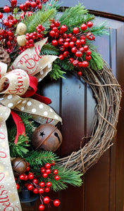 Christmas wreath~farmhouse decor~Sleigh Bells~front door wreath~rustic bell wreath~red berry wreath