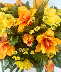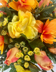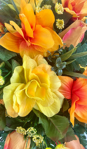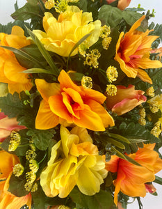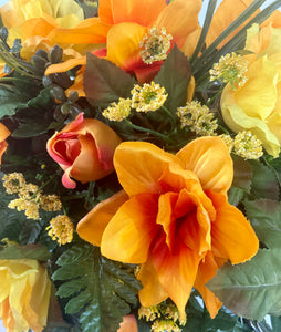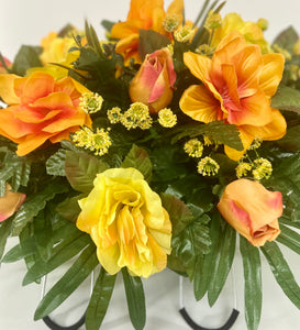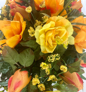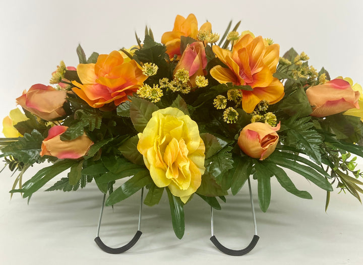 This newly designed cemetery headstone saddle is ideal for Fall. The bright orange, yellow and multi colored flowers are mixed with palm and leather leaf fern for a very full look. The saddle measures approximately 24 inches long, 14 inches wide, and 10 inches tall once placed on the headstone marker. This saddle is designed to last 3-4 months in the elements. It fits most standard size headstones that are 4-6 inches wide.
