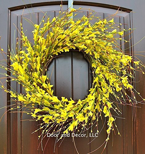 ON SALE! The forsythia shrub is one of the first to show her blooms in the spring here in the South. They always remind me of Summer since they bloom so long. Their simple yellow blooms are delicate but showy. This wreath captures that essence with the silk blooms and greenery. They are truly gorgeous in both shape and color. They mimic the real thing perfectly!