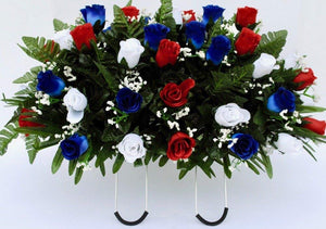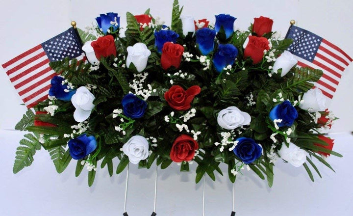 Patriotic Cemetery Headstone Saddle Flowers in Red White and Blue Roses with Flags