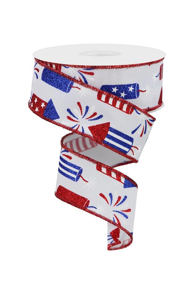 Show off your love for the country and Fourth of July celebrations with this firecrackers on diagonal weave ribbon! As this ribbon includes a wired edge, and an assortment of red, white and blue firecrackers on a white background, it will be a versatile addition to any display you see fit! Consider using this ribbon in a wreath display, paired with a matching sign!