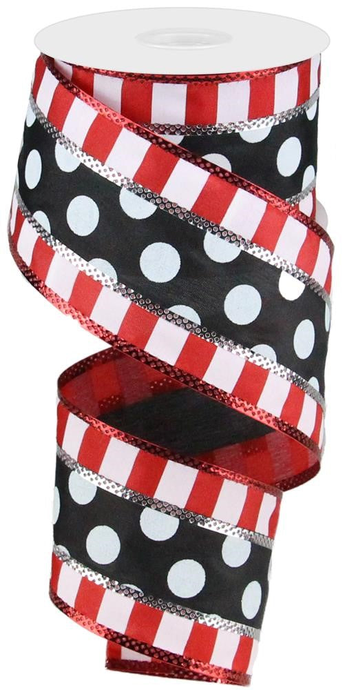 Polka Dots with Stripes Wired Edge Ribbon - 10 Yards (Black, White, Red, Silver, 2.5")