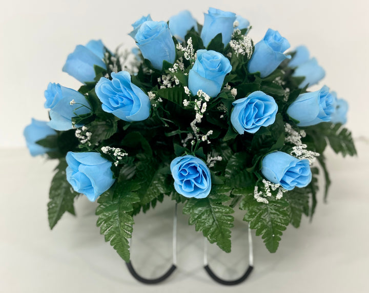 We are happy to present this beautiful flower arrangement with light blue roses, baby's breath, and ferns. This bright and full arrangement is built on a smaller saddle with adjustable legs made to grip the grave marker. Each leg has an adjustable rubber covering to prevent scratching or discoloring the marker stone. The overall length of the arrangement is roughly 18 inches and the width is roughly 12-14 inches. The floral arrangement is approximately 10-12 inches tall (once placed on the marker).