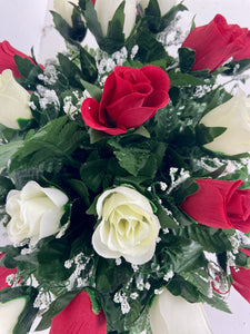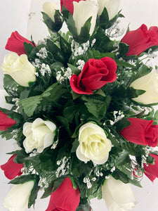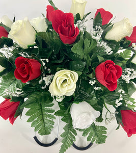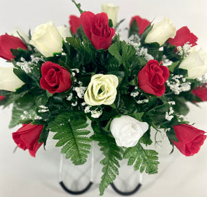 This headstone arrangement of red and cream roses is perfect for Memorial day through Labor Day. This bright and full arrangement is built on a saddle with adjustable legs made to grip the grave marker. Each leg has an adjustable rubber covering to prevent scratching or discoloring the marker stone. The overall length of the arrangement is roughly 18 inches and the width is roughly 12-14 inches. The floral arrangement is approximately 12-14 inches tall (once placed on the marker).
