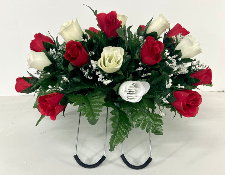 Small Cemetery Headstone Saddle Flowers in Red and Cream Roses
