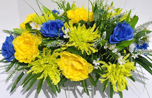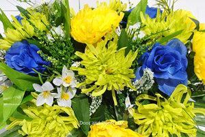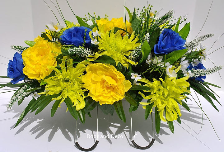 Spring and Summer Cemetery Headstone Saddle Flower Arrangement with Yellow, Blue, and Green Flowers
