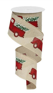 Vintage Red Truck With Christmas Tree Wired Ribbon 2.5" X 10 Yards